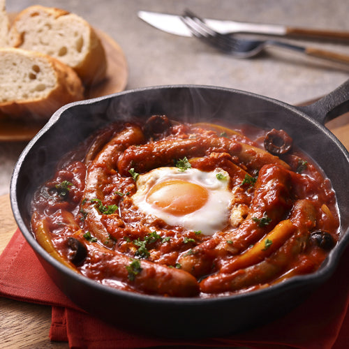 例えば、写真の料理、フラメンカエッグ。フラメンカエッグはスペインの伝統的な料理です。チョリソーを一口大にカットしてフライパンで焼き、トマトソースと卵を入れ、少しだけ火を通せば、まろやかな卵とスパイシーなチョリソーが絶妙に絡み合います。